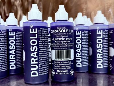 Durasole® is formulated and intended for use only on the equine frog and sole. When applying, wear safety lenses and liquid impermeable gloves. Do not breathe vapors. Do not smoke, eat, or drink while applying. Harmful or fatal if swallowed. If spilled on the skin, remove immediately with isopropyl alcohol; if splashed in the eyes, flush with water and seek medical attention immediately. Keep out of reach of children. Flammable, keep away from sparks or open flames. Do not apply above the sole of the foot, to be used on the sole and frog ONLY.